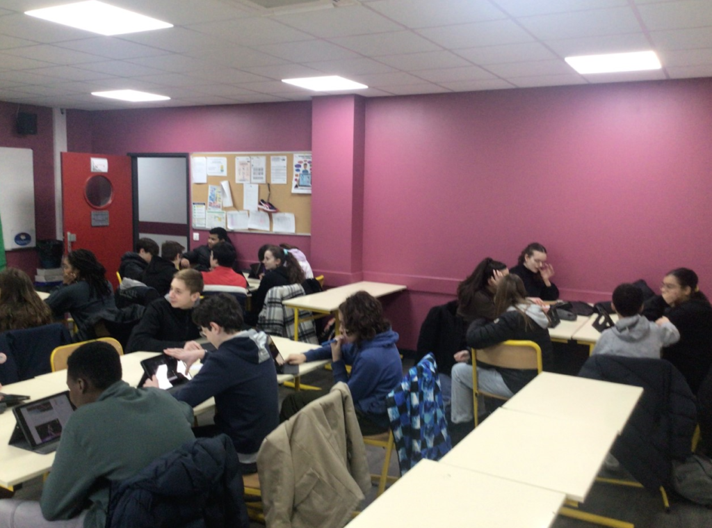 Après sollicitations de mesdames Bourget et Najeh, professeures d’espagnol et d’anglais en cycle 4 qui élaborent un projet de JT en classe de 3ème Tremplin, je me suis proposé de venir observer et prêter main forte pour faire intervenir les équipes volontaires. Du matériel a pu être apporté : le fond vert prêté par le CDI du collège, un trépied apporté par Arthur mais aussi ma tablette en guise de caméra supplémentaire.