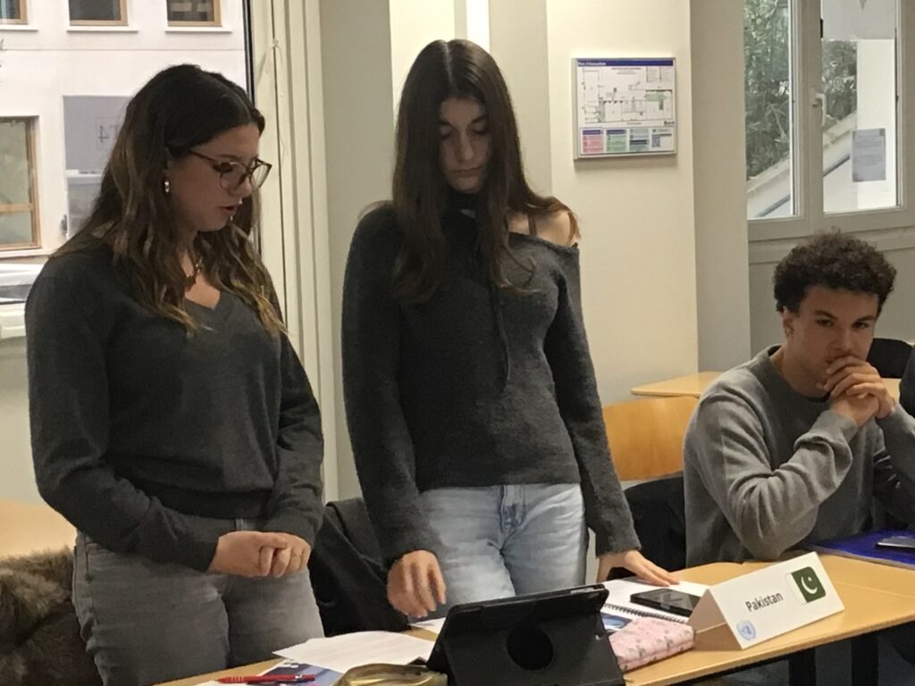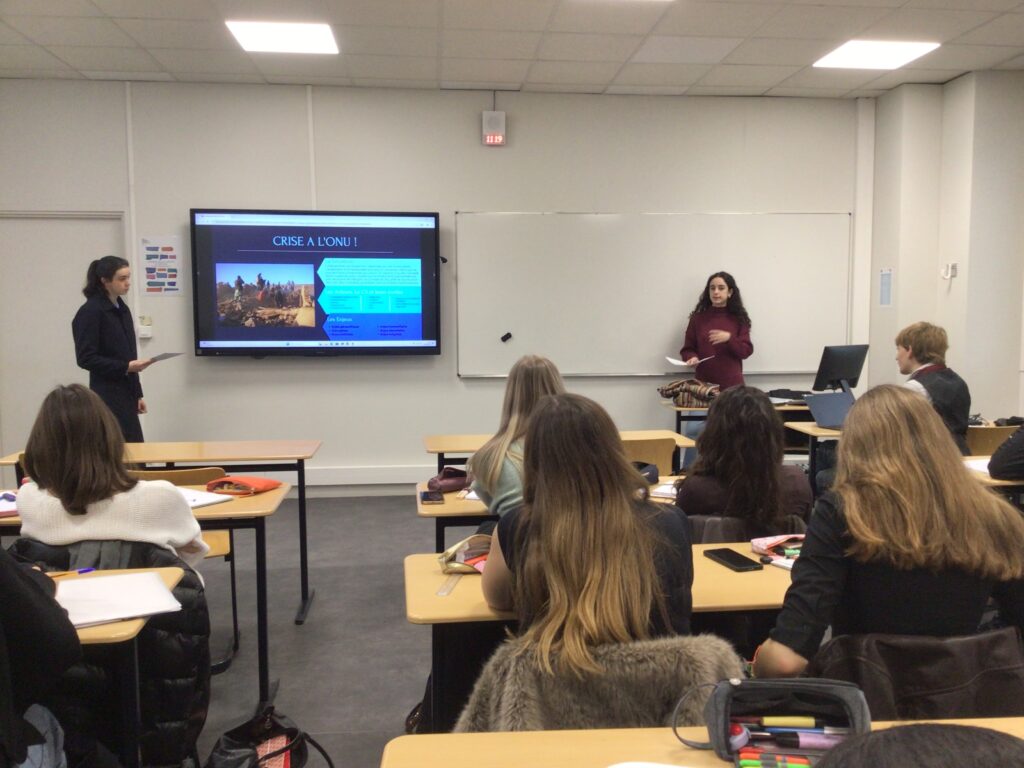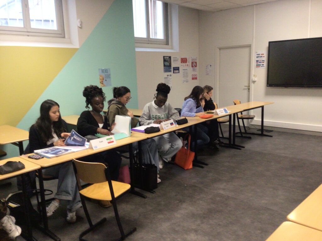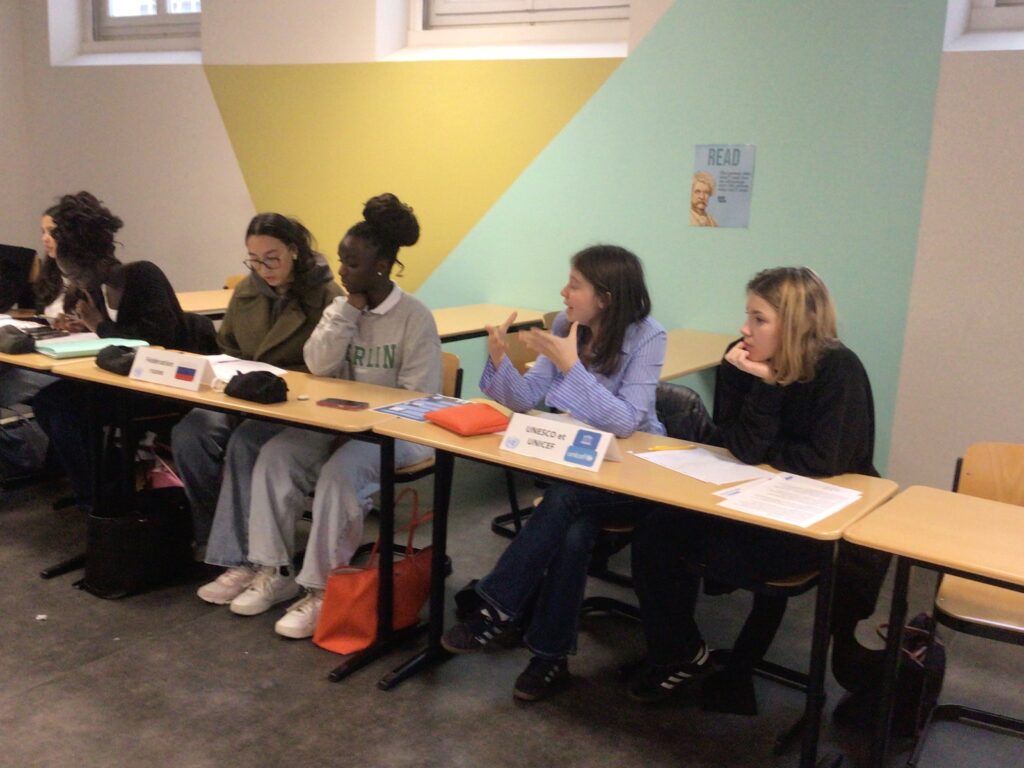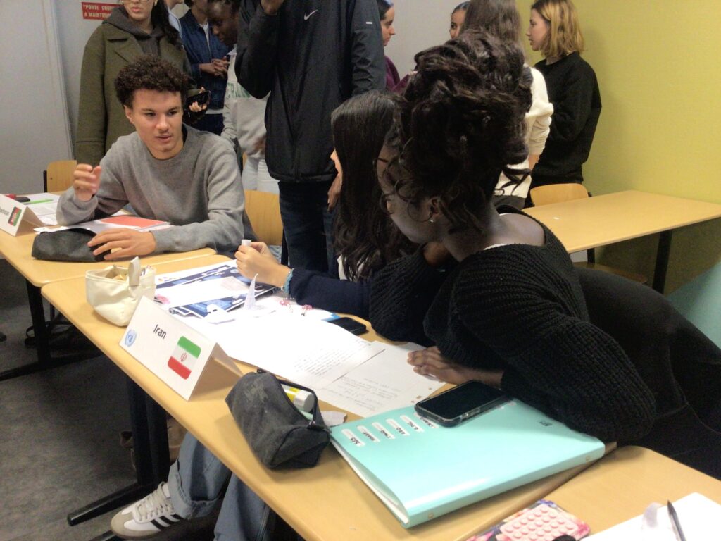 Au cours de cet exercice, les participants travaillent en équipe pour défendre les positions d’un pays sur un thème de négociation. L’objectif est de négocier pour parvenir à l’adoption par consensus d’une résolution sur un sujet qui aura été décidé en amont de la préparation à ce jeu. Le lycée propose aux élèves de Première et de Terminale volontaires d’intégrer le club MUN, dirigé par Kadhya Savane (T6) et Lilou Grotherr-Douieb (T4).