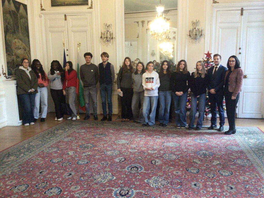 Enfin, le 5 décembre nous nous sommes rendus en Bulgarie : pas d’aller-retour express à Sofia dans la journée, mais une visite à l’ambassade à Paris afin de rencontrer Son Excellence Madame l’Ambassadeur Radka Balabanova-Ruleva ainsi que deux diplomates qui nous ont expliqué leur parcours et les fonctions qu’ils remplissent au quotidien. Nous avons été très chaleureusement accueillis et les élèves se sont montrés curieux et très intéressés, posant beaucoup de questions. Une belle expérience !