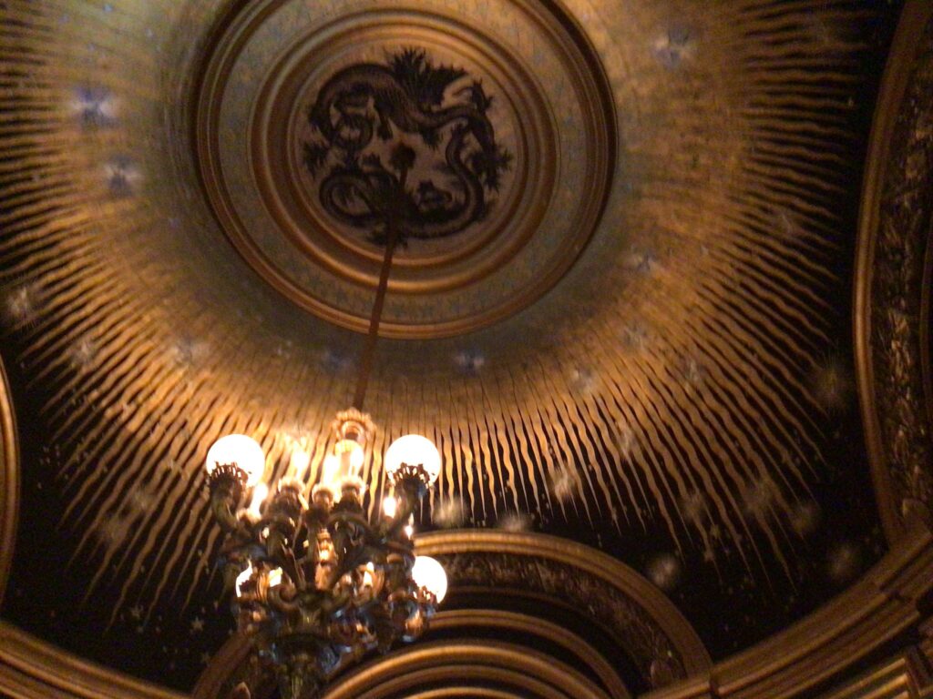 « Dans la salle du foyer, ce qui m’a surpris était de voir aux deux extrémités de la salle, deux bustes accrochés au plafond : l’un représentant un homme, et l’autre une femme. Celui représentant un homme était le portrait de Charles Garnier mais avec les attributs associés à Hermès tels présents dans la mythologie grecque comme le caducée, les sandales et les ailes. Tandis que celui représentant une femme était celui de la femme de Charles Garnier à savoir Louise Garnier.