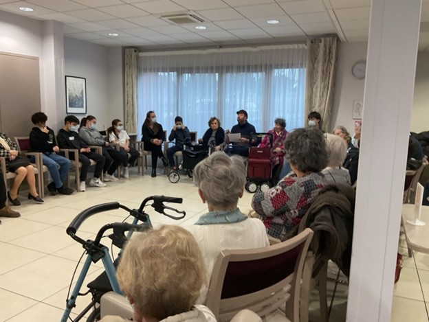 J’ai accompagné la classe de 5ème 3 à une sortie pédagogique organisée par Madame Bourget dans une maison de retraite. Les enfants ont pu, à cette occasion, participer à deux ateliers : un de philosophie et un autre de psychologie, avec les résidents.