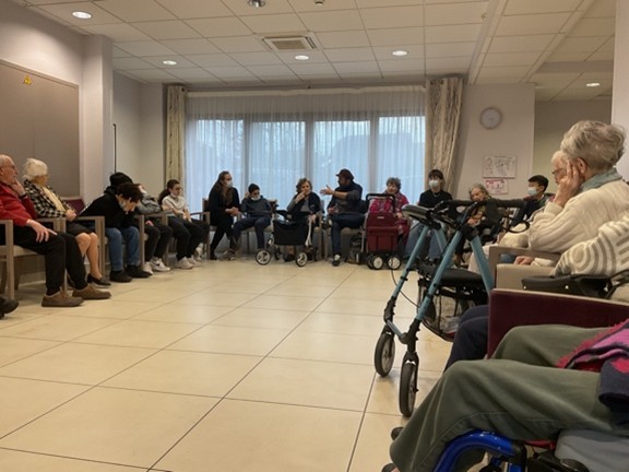 Nous avons chanté tous ensemble et partagé un goûter puis nous sommes allés chacun avec un résident et nous avons parlé, discuté et rigolé avec eux. Ils nous ont raconté un peu leur vie, ce qu’ils ont vécu, nous nous sommes présentés et eux aussi.