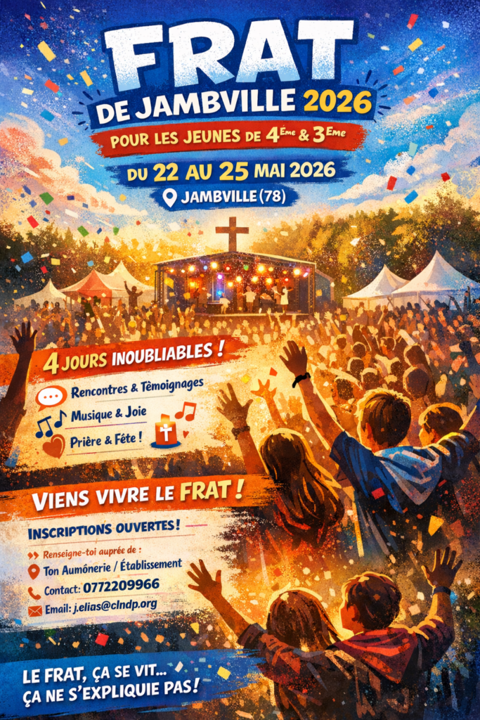Il est encore temps cher jeune en 4ème ou en 3ème (avec l’accord et l’aide de tes parents) de t’inscrire au Frat de Jambville cette année du 22 au 25 mai 2026