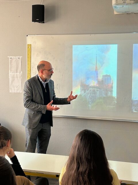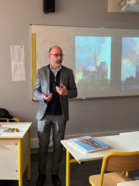 Le lundi 16 mars, les élèves de 3ᵉ8 et 3ᵉ9 inscrits en catéchèse ont assisté à une conférence animée par Mathieu Lours, historien de l’architecture, spécialiste des édifices religieux et de l’architecture française à l’époque moderne. Il est notamment l’auteur du livre de référence Rebâtir Notre-Dame de Paris – Le livre officiel de la restauration (édition spéciale 2025).